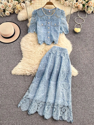 Elegante vestido longo de pérolas, conjunto feminino de 2 peças, manga curta, flor, bordado, camisa de renda, saia midi evasê