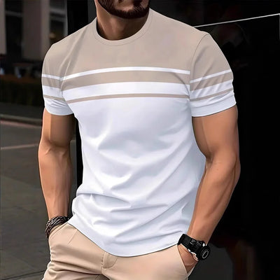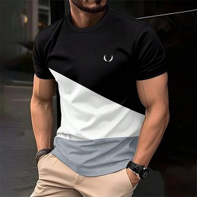Camiseta masculina de verão 2025 com estampa 3D e blocos de cores, casual, slim, manga curta, para esportes ao ar livre, corrida, fitness