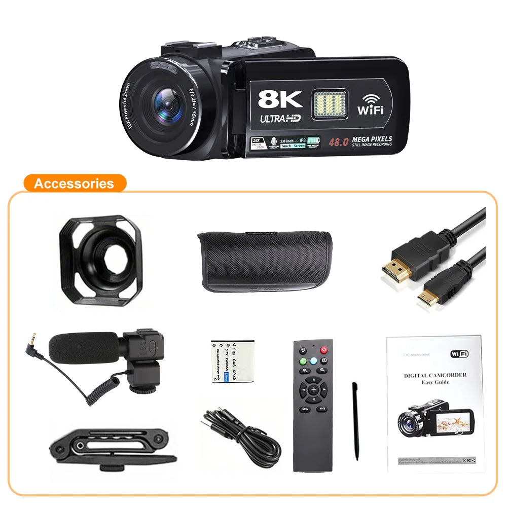 Câmera de vídeo 8K, tela LCD sensível ao toque de 3 polegadas, 60 FPS/64 MP, zoom digital de 18x, gravadora Ultra HD, Wi-Fi, filmadora portátil